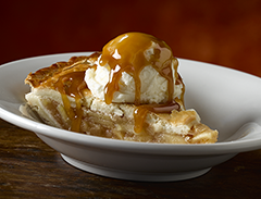 Homestyle slice of apple pie topped with vanilla ice cream and honey cinnamon caramel sauce